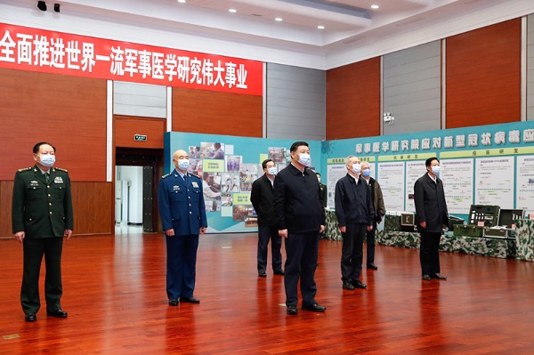 3月(yuè)2日(rì),中共中央總書(shū)記、國(guó)家(jiā)主席、中央軍委主席習(xí)近(j$ìn)平在北(běi)京考察新冠肺炎防控科(kē)研攻關工(gōng)作(zuò)。這(zhè)是(shì)習(xí)近(∏jìn)平在軍事(shì)醫(yī)學研究院結合展闆和(hé)實物(wù)了(le)解疫苗和(hé)抗體(tǐ)研制(zhì)、藥物(wù)篩選、病毒緻病機(jī)<理(lǐ)研究、快(kuài)速檢測試劑研究和(hé)應用(yòng)等進展情況。