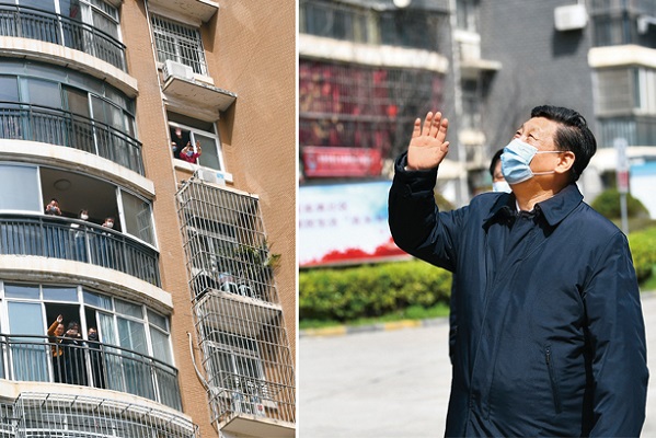 2020年(nián)3月(yuè)10日(rì),中共中央總書(shū)記、國(guó)家(jiā)主席、中央軍委主席習¶(xí)近(jìn)平專門(mén)赴湖(hú)北(běi)省武漢市(shì)考察新冠肺炎疫情防控工(gōng)作(zuò)。這(zhè)是(shì)習(xí)近(jìn)平γ在東(dōng)湖(hú)新城(chéng)社區(qū)考察時(shí),向在家(jiā)隔離(lí)居住的(de)居民(mín)揮手緻意、表示慰問(wèn)(拼版照(zhào)片)。≠